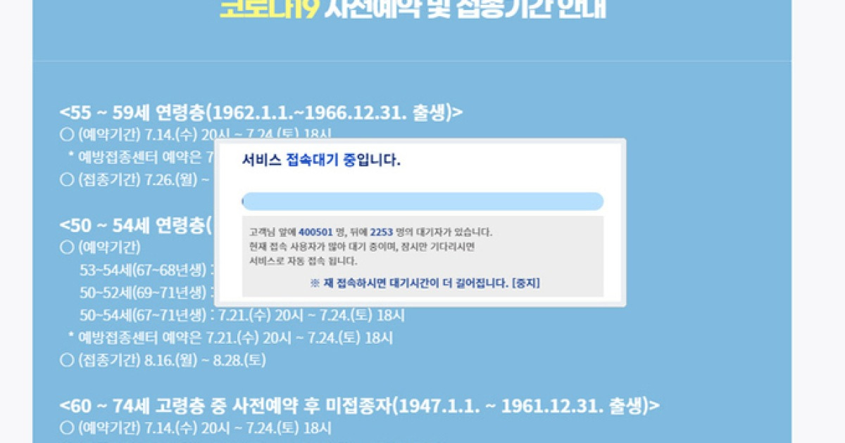 만 55~59세의 코로나19 예방접종 사전예약이 백신 부족으로 채 하루도 안 돼 중단됐다 백신사전예약. 55~59세 대상 코로나19 백신 사전예약 중단.